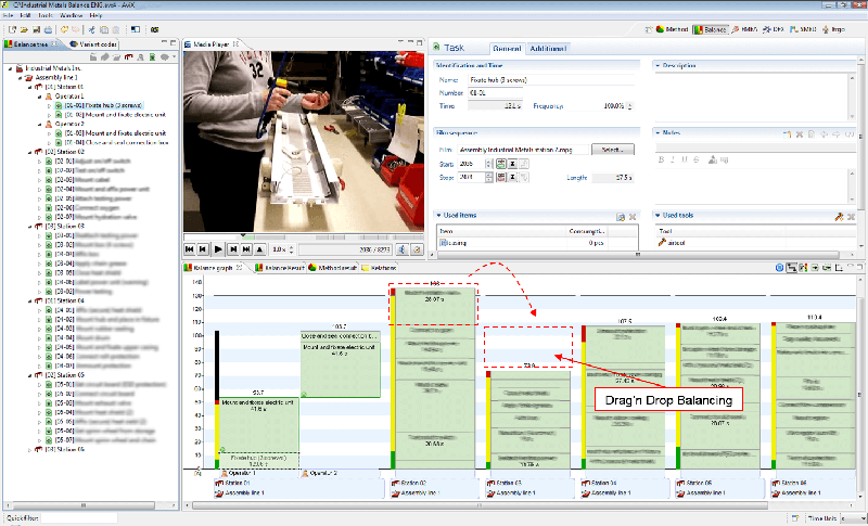 As we typically find, people are generally working as fast as they can but are still spending a lot of time standing around waiting or performing extra steps that undermine performance efficiency. The software helps engineers find the best balance by dragging and dropping tasks between positions. As they move them, it displays a running tally of the value-added and non-value-added work at each station.