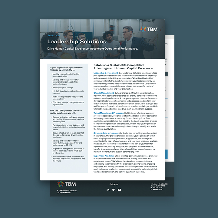 Often, even top-performing employees promoted to supervisors do not possess the leadership acumen which can result in increased turnover, poor employee engagement and hiring challenges. TBM’s Supervisor Academy prepares both new and existing supervisors with the expertise in guiding teams, engaging employees, and refining processes. This training ensures supervisors are ready to improve production management, support the well-being of their teams and organization, and achieve significant outcomes.