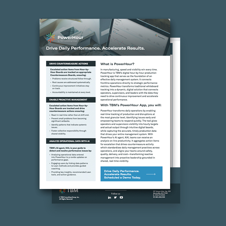 PowerHour is TBM’s digital hour-by-hour production tracking app that serves as the foundation of an effective daily management system. It connects frontline operations directly to strategic performance metrics. PowerHour transforms traditional whiteboard tracking into a dynamic, digital solution that connects operators, supervisors, and leaders with the data they need to drive continuous improvement and accelerate operational performance.